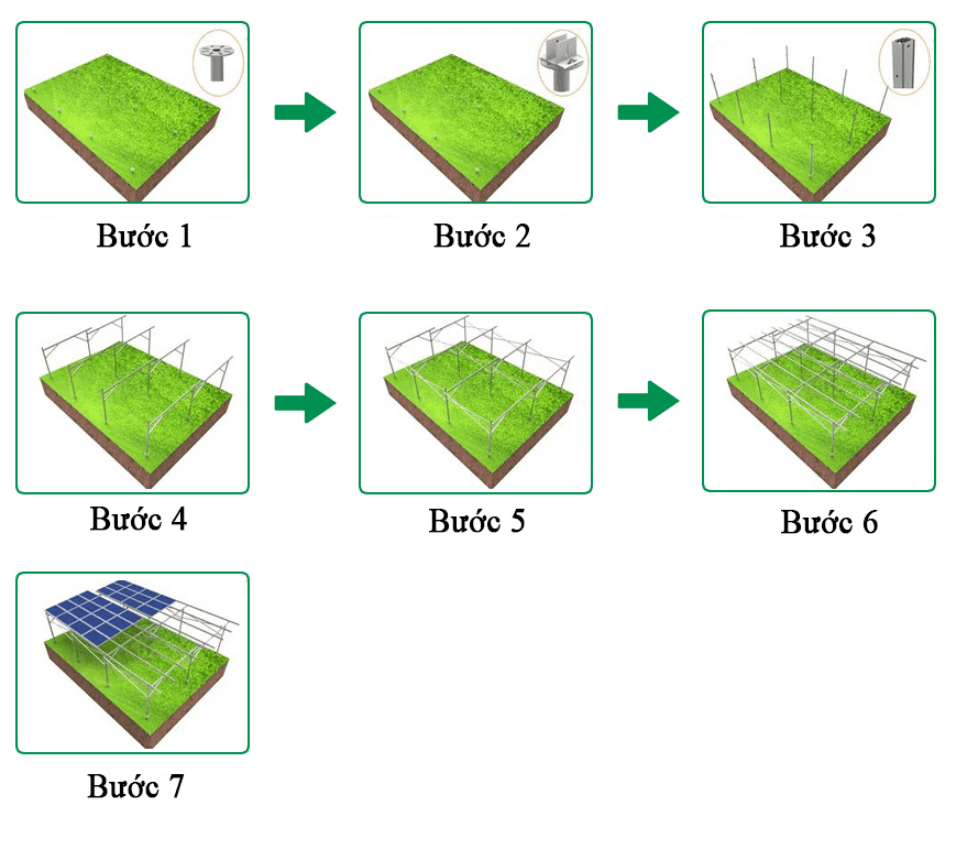 Giải pháp lắp đặt hệ thống điện năng lượng mặt trời giá treo có trụ bê tông gắn trên mặt đất giúp tiết kiệm chi phí lao động và rút ngắn thời gian lắp đặt.